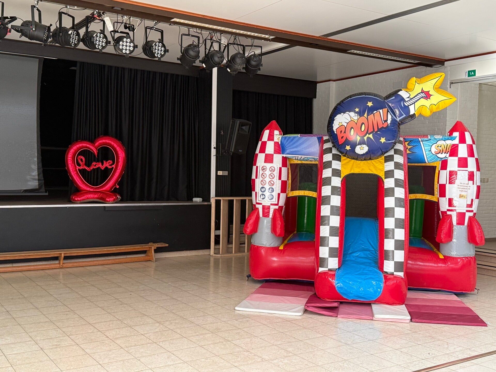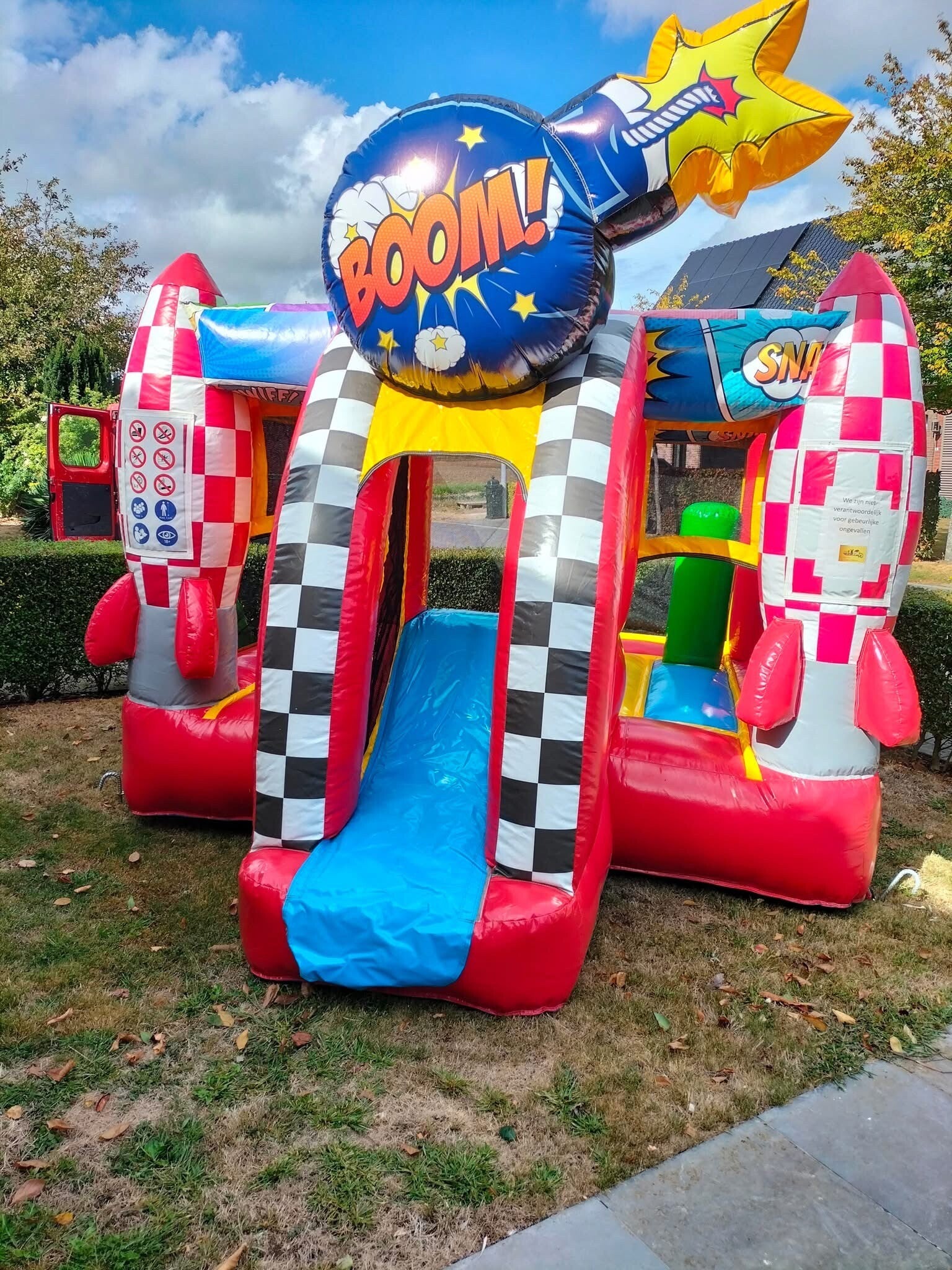 Op het springvlak zijn obstakels geplaatst en er is een coole glijbaan in het midden.